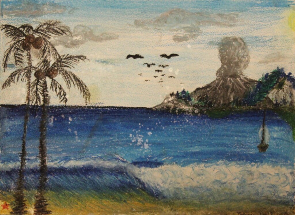 In this canvas of colors, I, Tahera, invite you on a journey to the serene seascape I’ve brought to life with my pastels. The tranquil blues of the ocean, the stoic grace of the palm, and the majestic silence of the distant mountain form a symphony of peace.