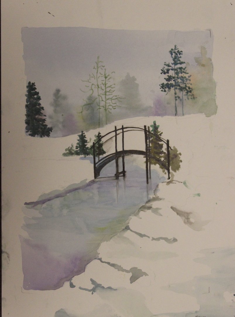 The bridge arched over the creek became my focal point—a sturdy structure against the elements. I stroked the paper with dark browns and hints of rust, giving life to the wood weathered by time and cold.